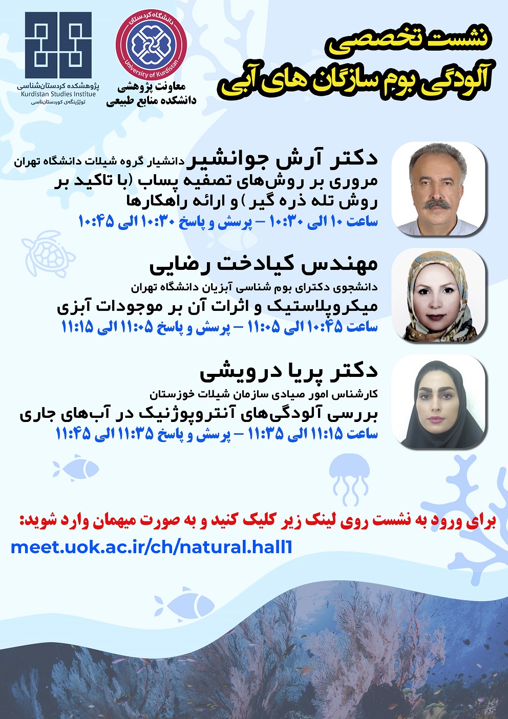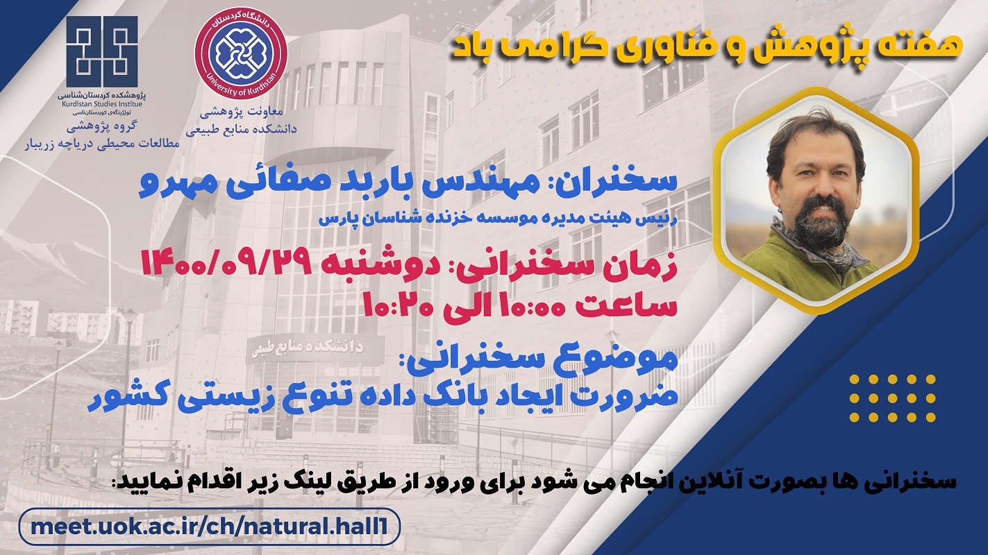 زمان: یکشنبه یکم خرداد ساعت: ۱۰:۳۰ صبح مکان: آمفی تئاتر دانشکده منابع طبیعی، دانشگاه کردستان حضور برای عموم علاقه مندان آزاد است.