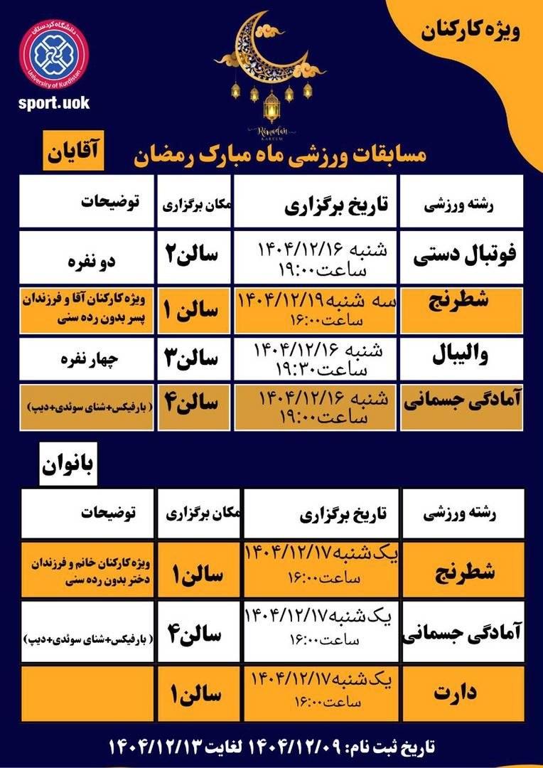 The University Physical Education Management is pleased to inform all colleagues that, on the occasion of the holy month of Ramadan, two educational workshops will be held to enhance knowledge regarding nutrition and the principles of physical activity during Ramadan. Additionally, sports competitions in various disciplines will be organized exclusively for university staff. The workshop syllabi and details of the competitions are provided below.